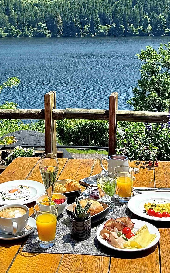 Un moment qui reflète toute la diversité des saveurs de la Forêt-Noire. Chez nous, vous profiterez non seulement d'ingrédients frais et de délices régionaux, mais aussi du calme et de la beauté de la nature qui s'étend juste devant votre porte. Le lac Titisee, les forêts et les montagnes vous accompagnent pendant votre petit-déjeuner et font de votre matinée un moment tout à fait particulier.